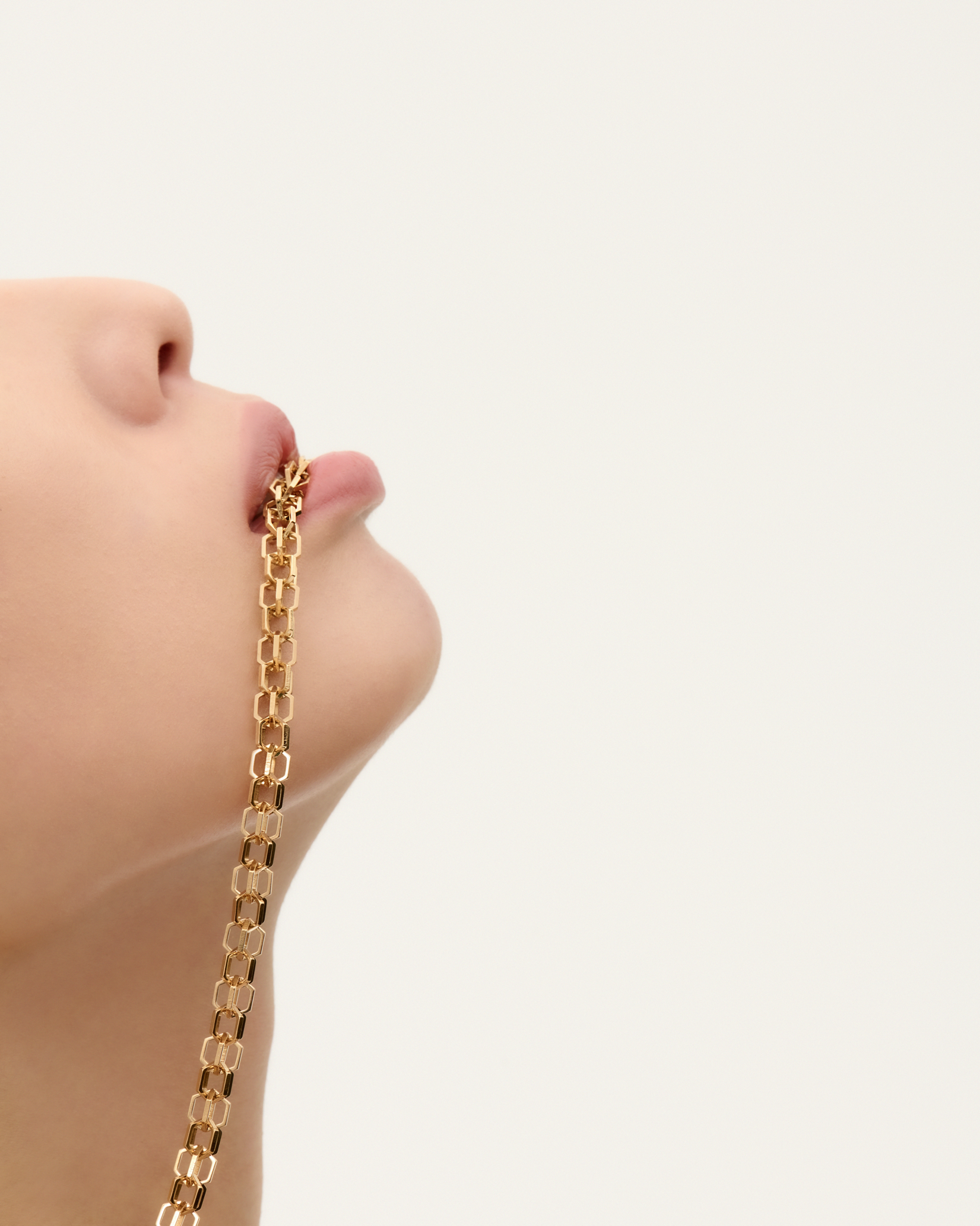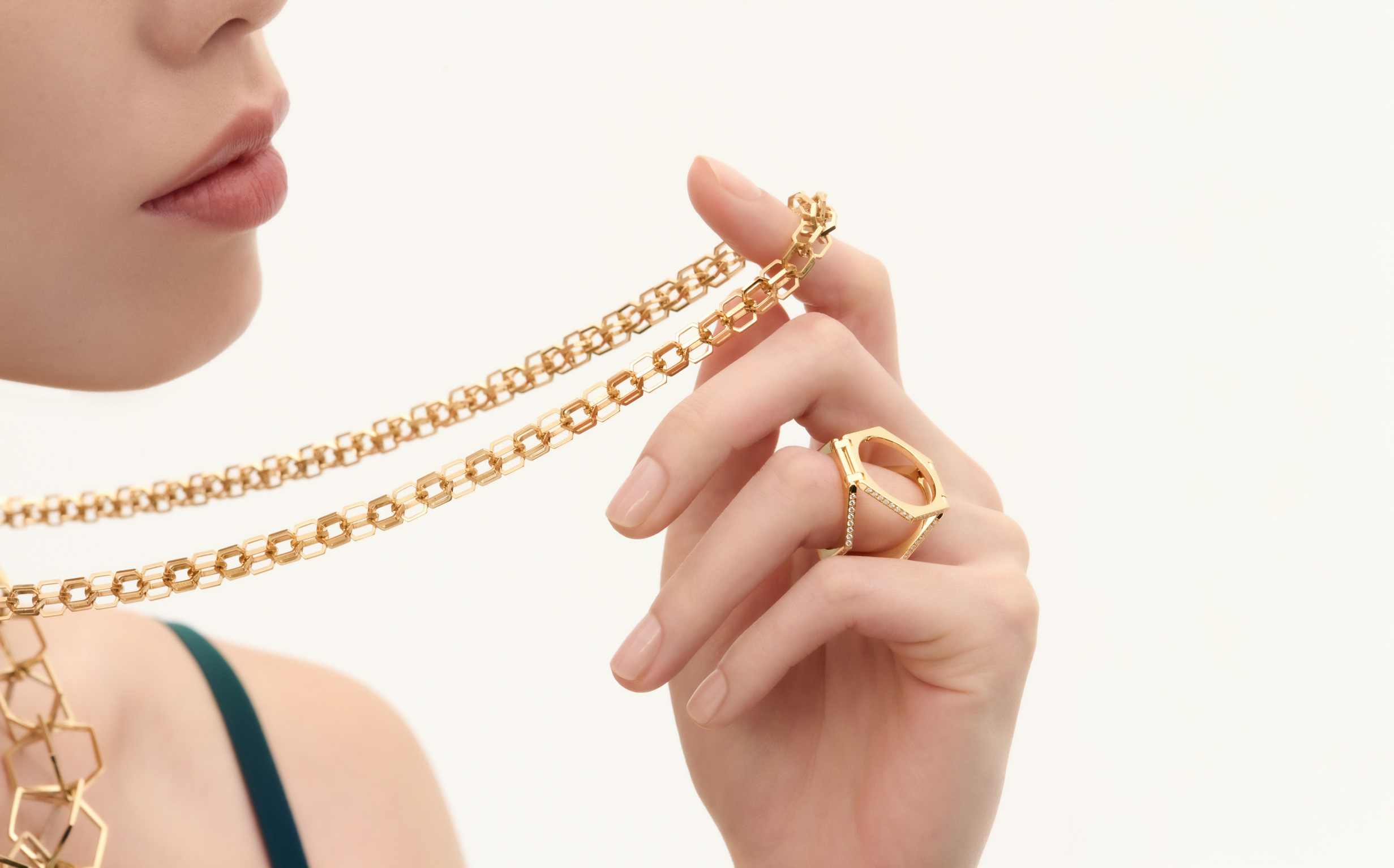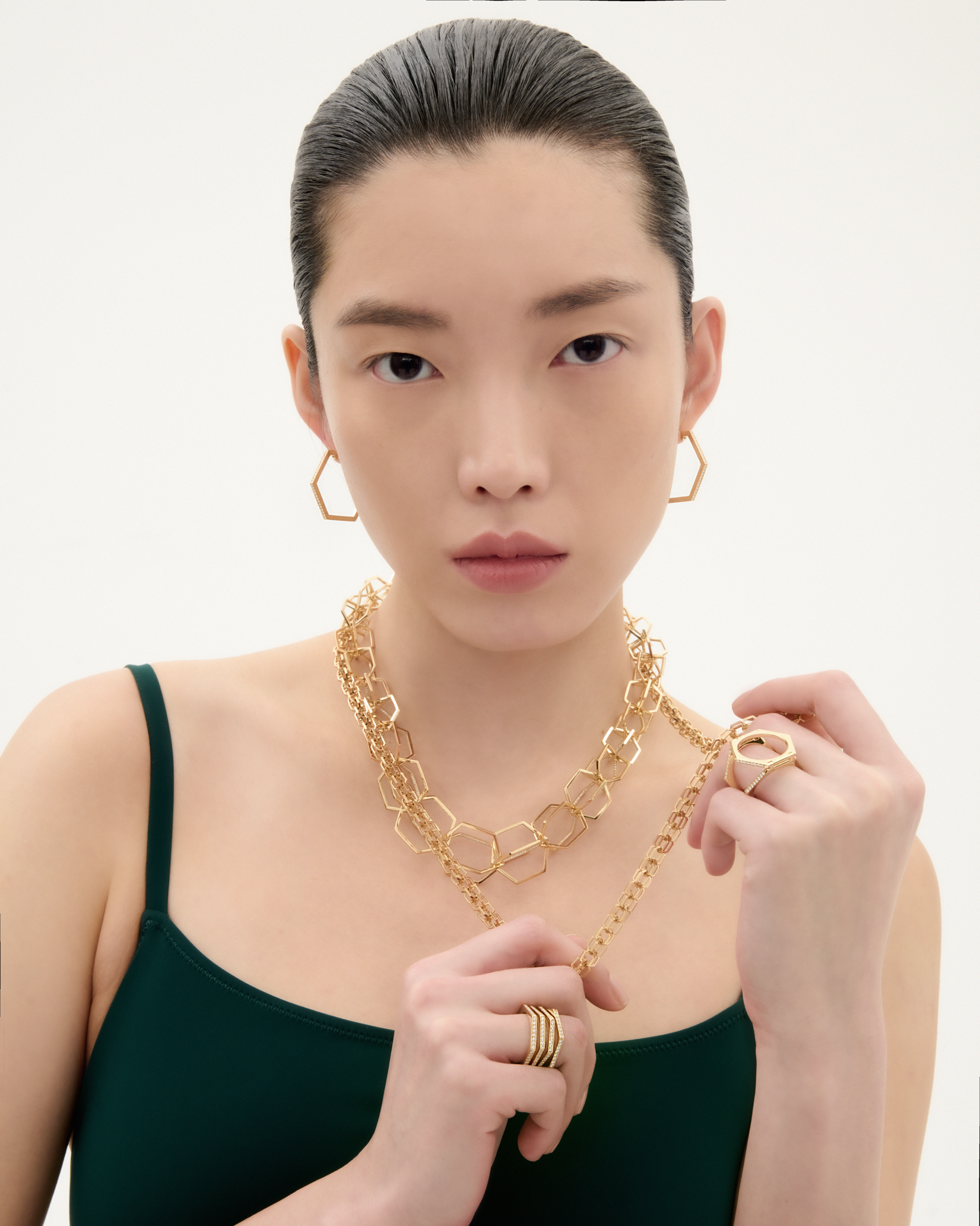 Golden honeycomb structures interlink and expand, forming veils of protection that empower the wearer. Bold geometric earrings are softened by delicate melee diamonds, while layered hexagonal rings unfold in luminous movement.