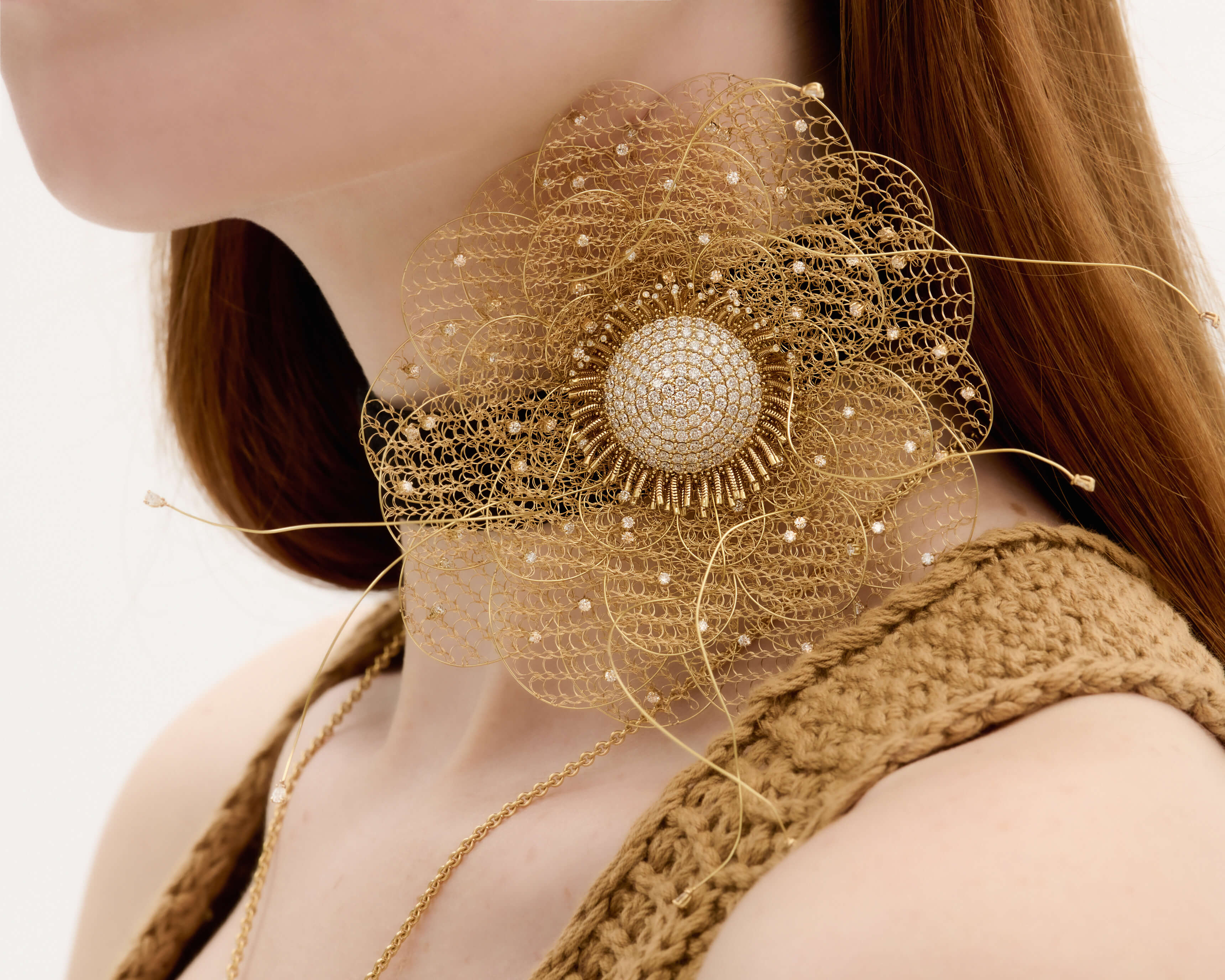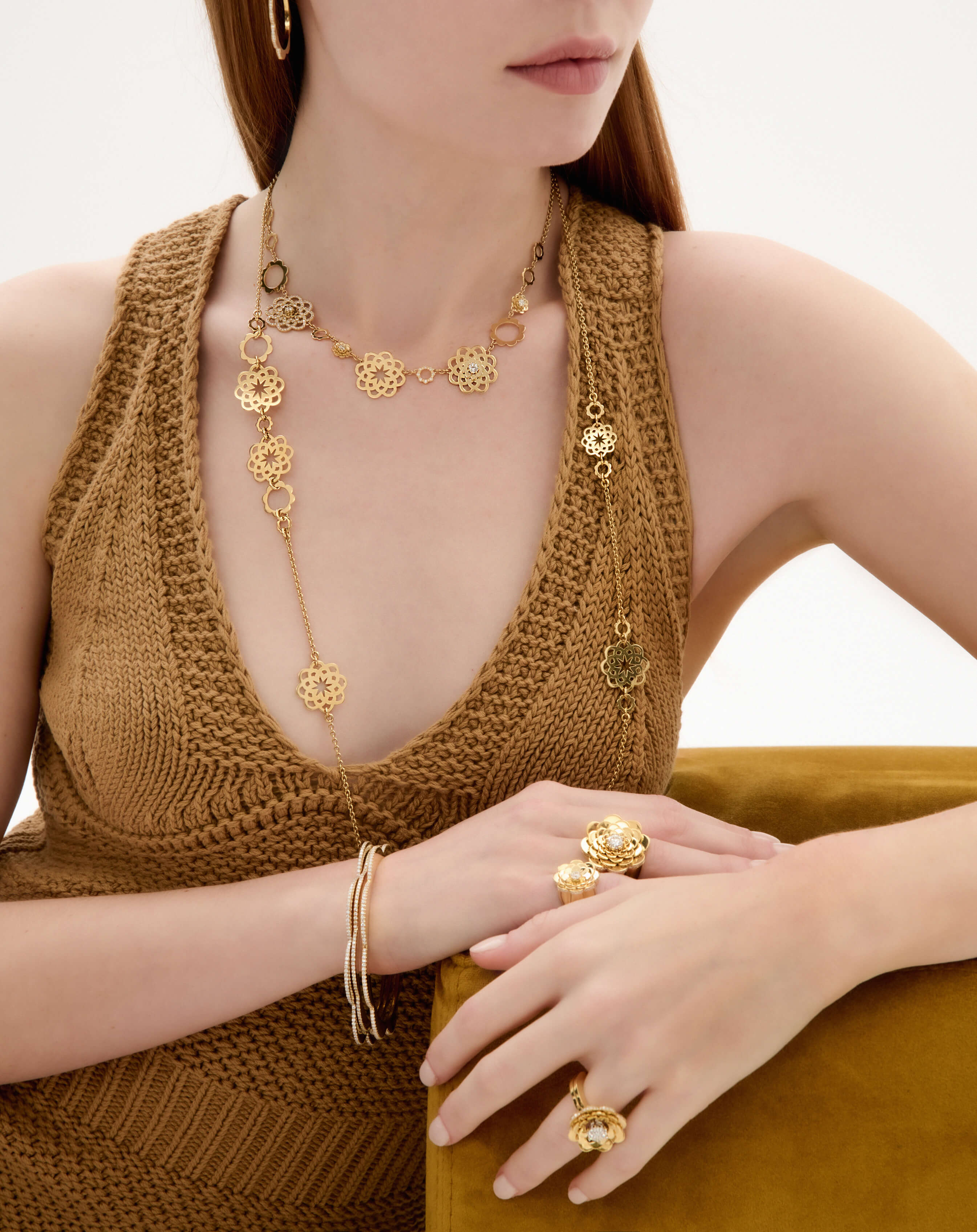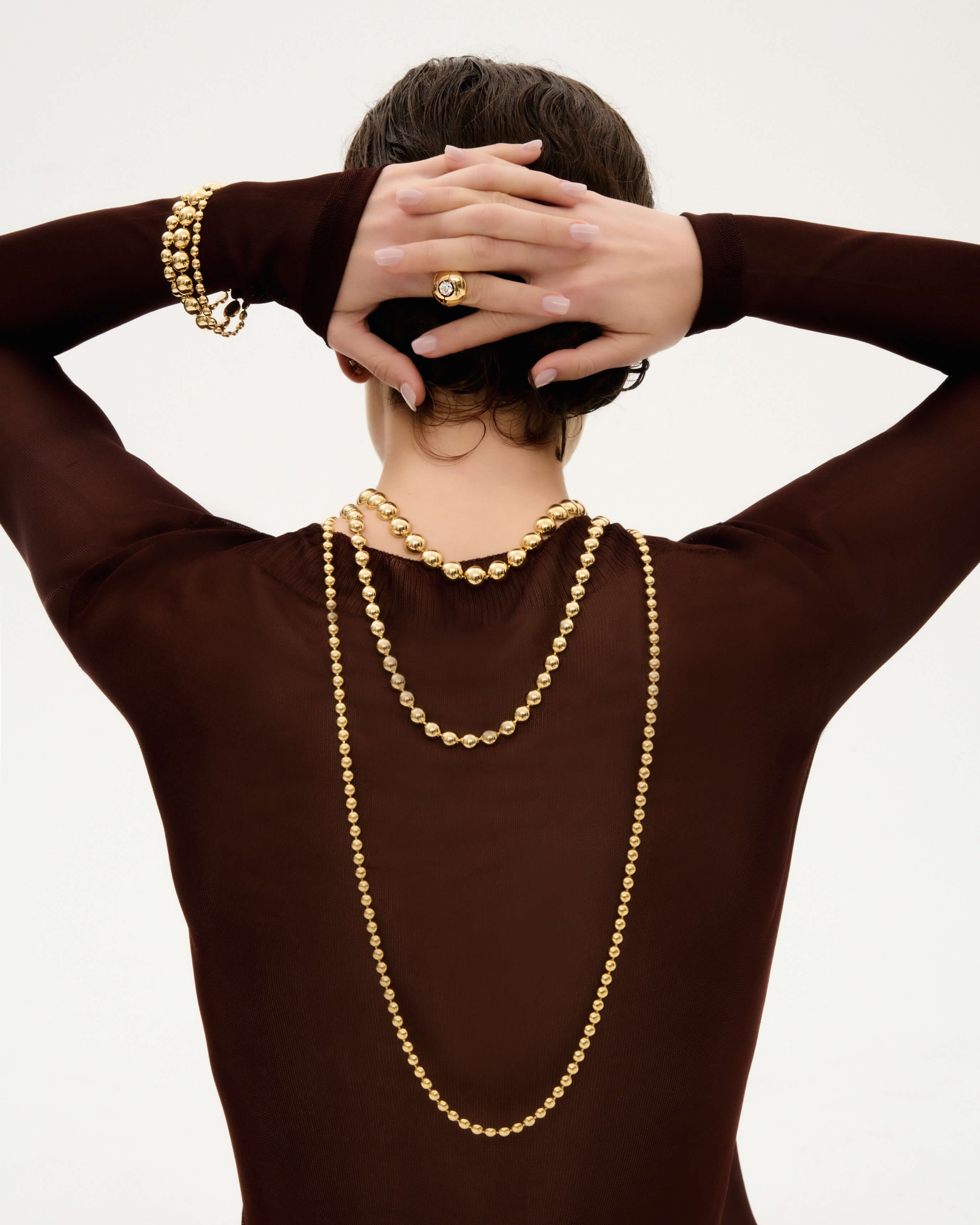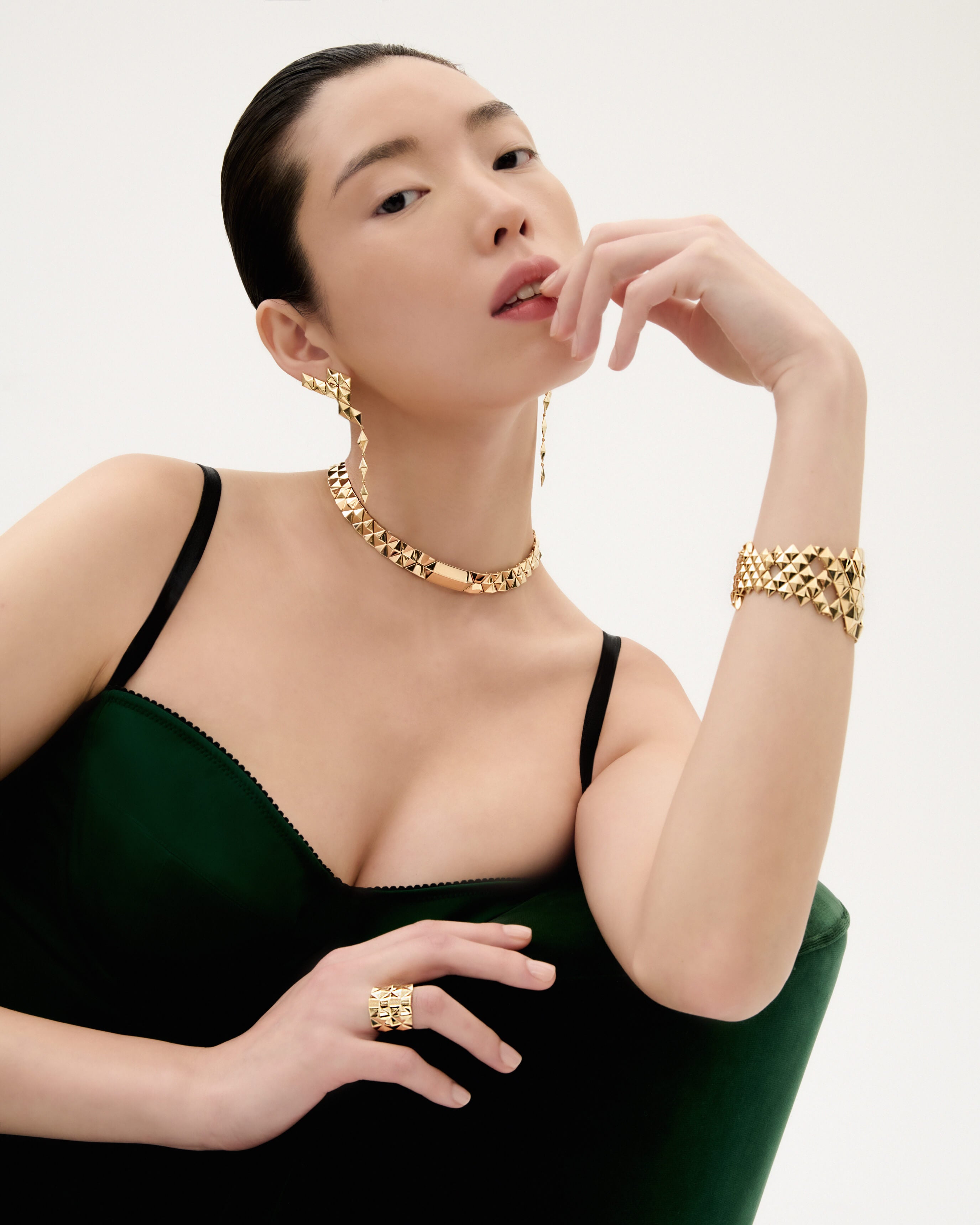 Reimagine gold as a texture that seamlessly meld to your skin, gently decorating your décolletage and elongating your neck.