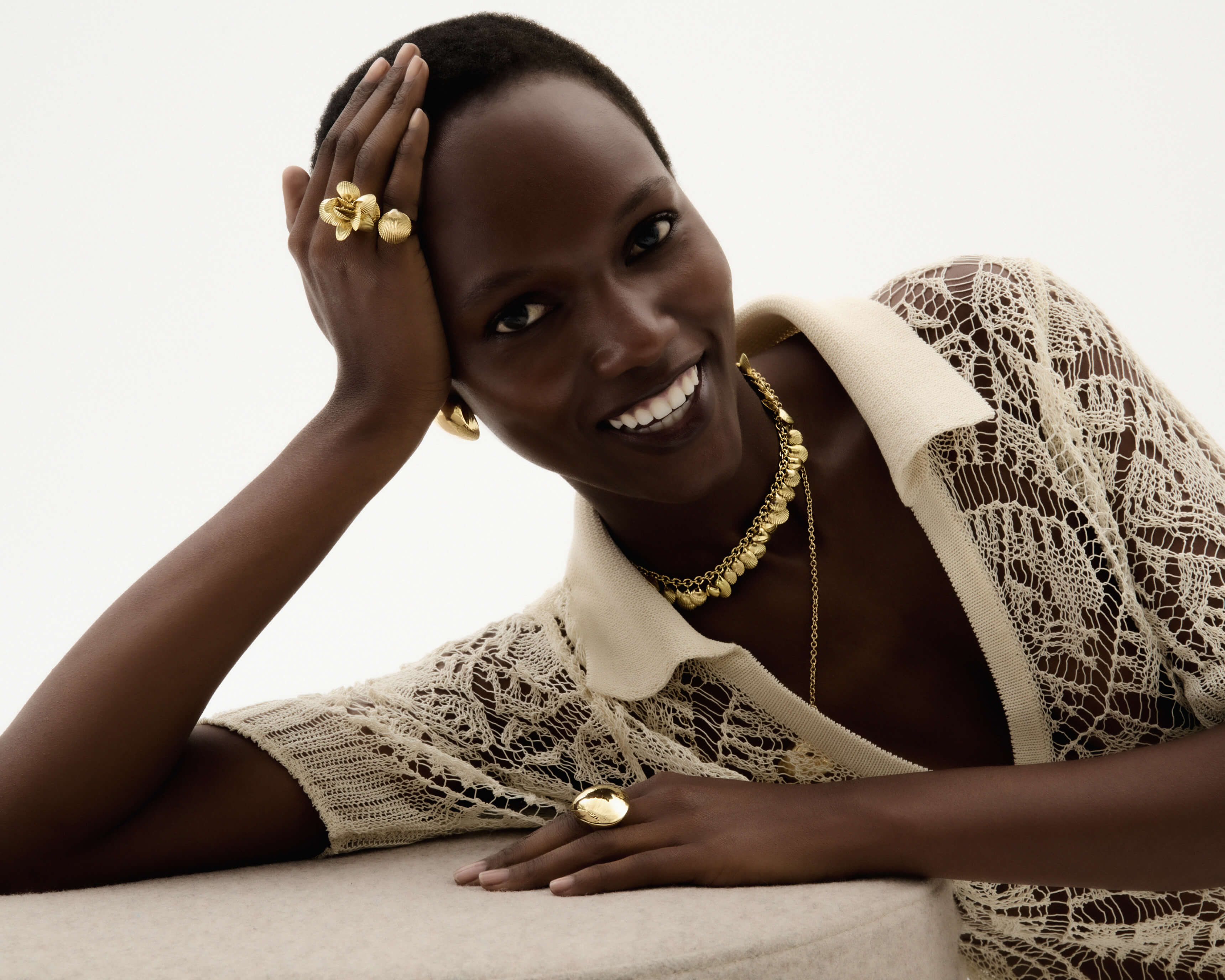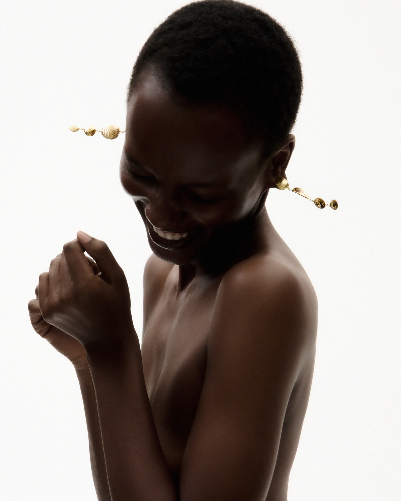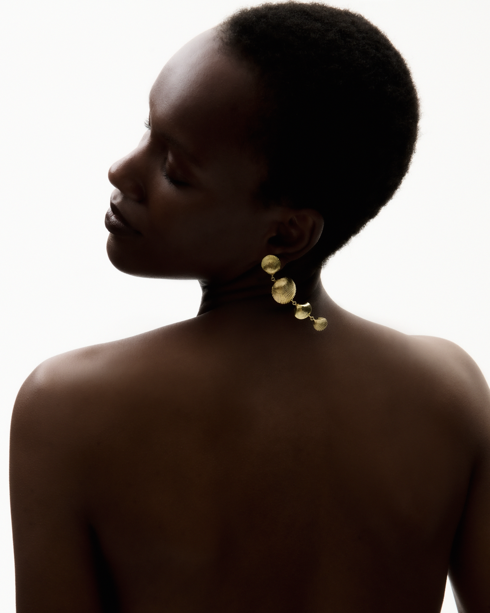 Soft, sculptural gold shells cascade around the body, their refined ridges and curves echoing the ocean’s rhythm. As they gently touch, they create a familiar, comforting sound, a sensory reminder of safety and serenity.