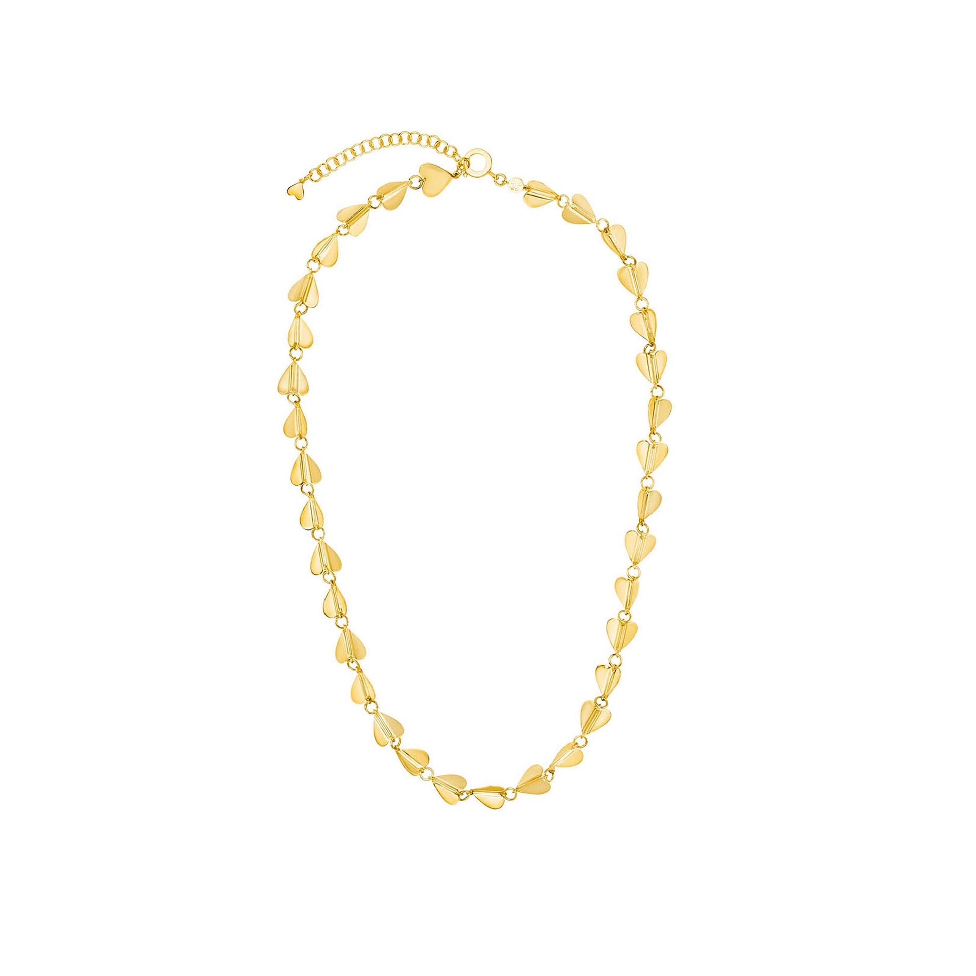 A string of 18K gold folded hearts links together to make this whimsical statement necklace. The length is adjustable so you can wear this flirty gold heart chain necklace in the length of your choice with the clasp in the back, flip it around for a y-shaped statement necklace, or loop it around your neck twice for a fun layered look.