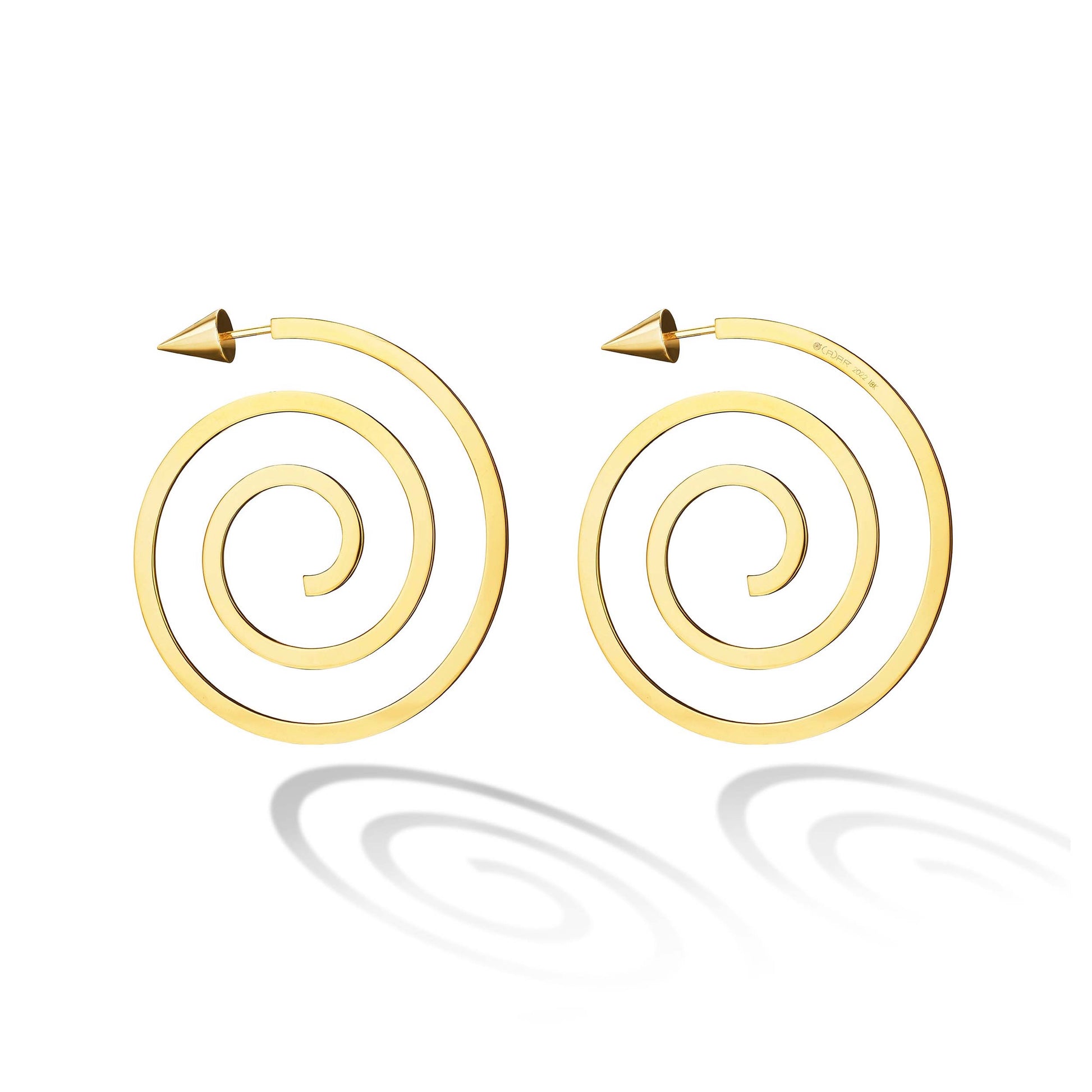 These 18K gold spiral hoop earrings from the Essence collection can be worn two ways--with the cone in the back for a stunning spiral hoop or wear the cone in front as a spiked stud with gleaming gold spiraling out the back. These earrings will make you feel brave and bold while still versatile enough to be a wardrobe staple.