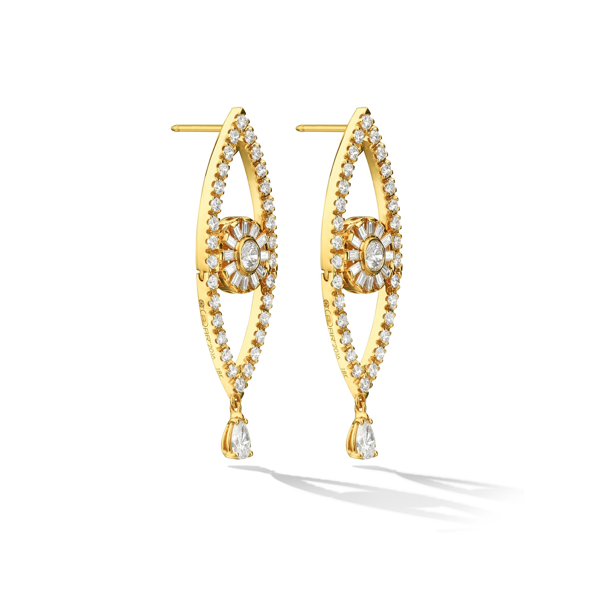 Decorated in glistening diamonds from post to tip, these showstopping, evil eye earrings illuminate every room with their beautiful symmetry and warm yellow gold hues. What does the eye symbolize for you? There are a thousand meanings behind the shape and white diamond placement of this earring from the sleek baguette-cut irises to the pear-cut hanging charm that resembles a tear drop. Find your own personal interpretation of these sparkling drop diamond earrings in yellow gold.